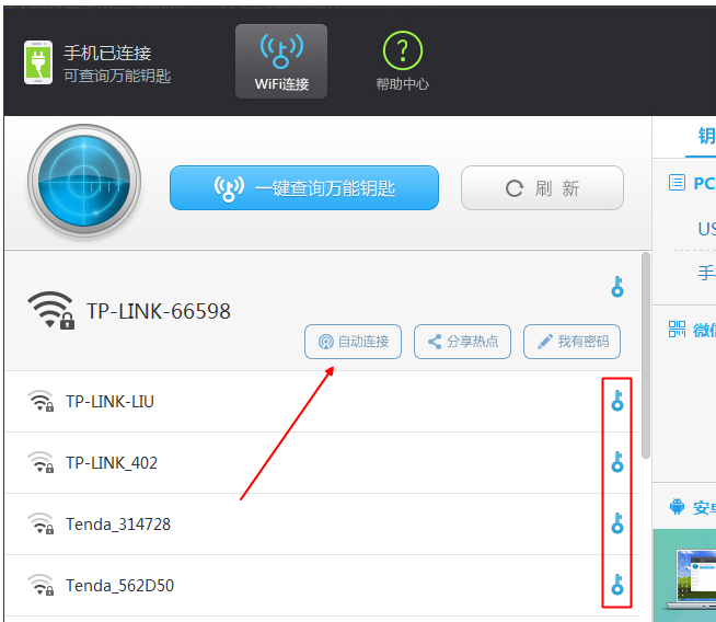 3、启用热点之后,手机先放一边。这时我们注意查看一下,WiFi万能锁匙电脑版的左上角,是否有显示“手机已连接”了!如果有,说明电脑已经成功共享手机的网络了,然后点击“一键查询万能锁匙”按钮。