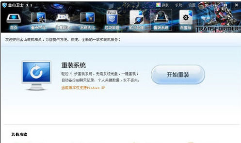 第一步:打开金山卫士,点击进入“重装系统”标签,进入“硬件检测”;