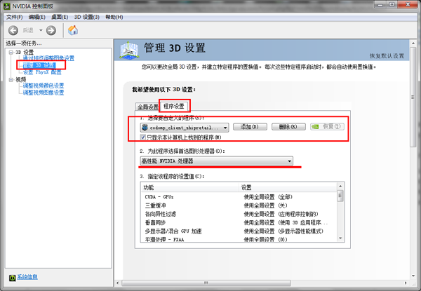 打开之后在“3D设置”中添加自定义的程序,注意下面要选择你的独立显卡