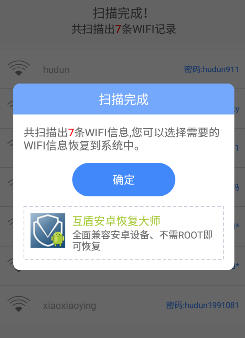 4.扫描完成后,软件界面会弹出扫描结果和一个“确定”按钮的弹框,点击“确定”按钮后,你可以勾选想要恢复的WiFi。软件会自动恢复数据。
