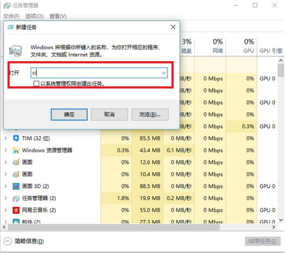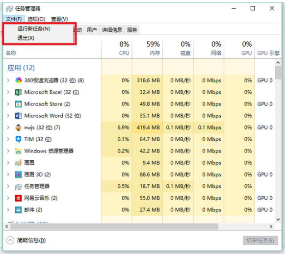 2、点击“详细信息”后,会出现完整的任务管理器窗口,选择“文件”-运行新任务,在弹出的对话框里键入“C:”点确定即可正常进入系统桌面。