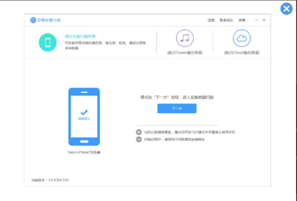 步骤一:运行已经安装好的软件,选择“iPhone/iPad设备恢复”根据提示将手机和电脑通过数据线连接起来。(万能苹果恢复大师可以支持从iPhone/iPad设备恢复和从iTunes备份中两种模式恢复。您能够根据情况自由选择。)