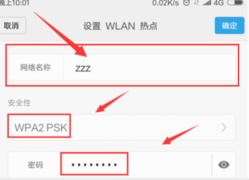 第四步:接着进入【设置WLAN热点】后,根据当前页面的【网络名称】、【安全性】进行设置。