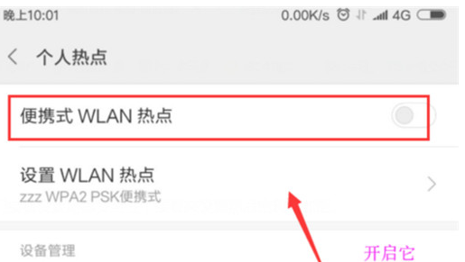 第七步:回到上一级操作页面,打开【便携式WLAN热点】使其后面的开关选项为蓝色状态即可。