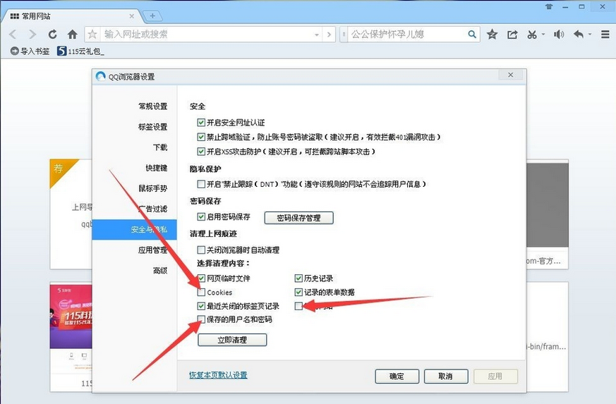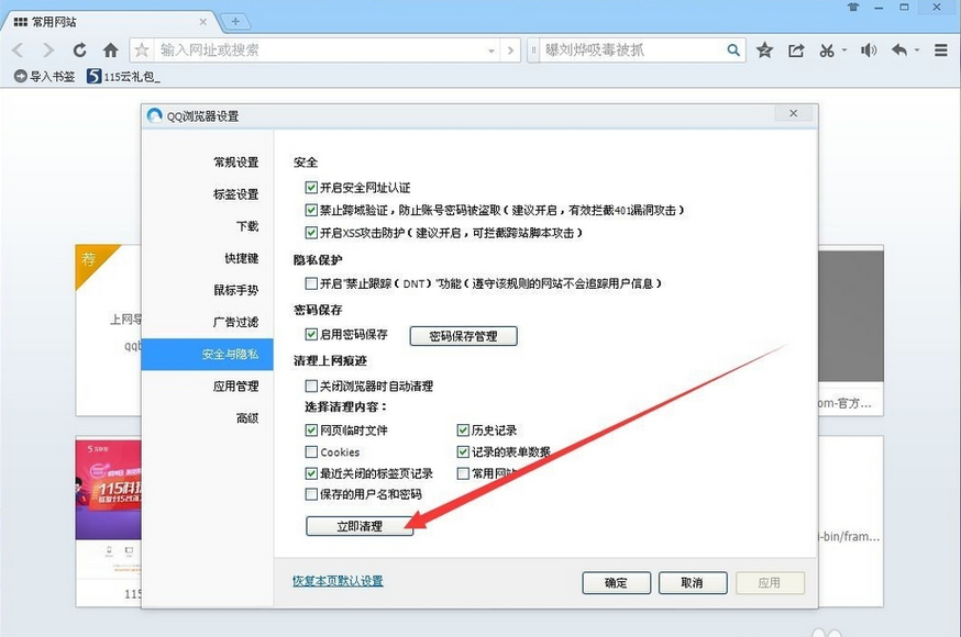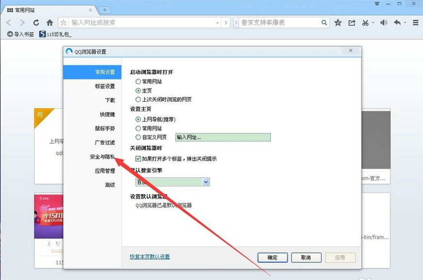 4、还有就是要想具体的清除痕迹,可以点一下设置,然后找到,安全和隐私点一下进入!