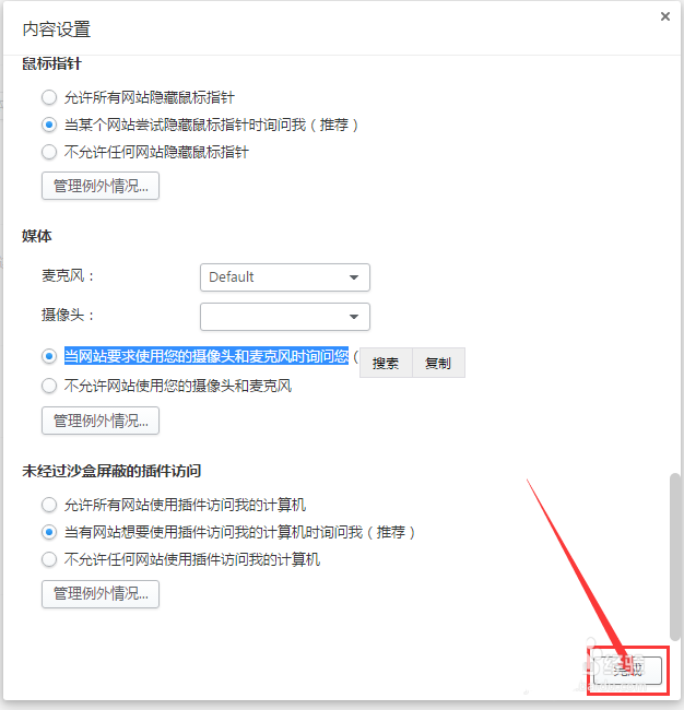 6、进入内容设置后往下拉可以看到【媒体】中的【当网站要求使用您的摄像头和麦克风时询问您】前面打上点