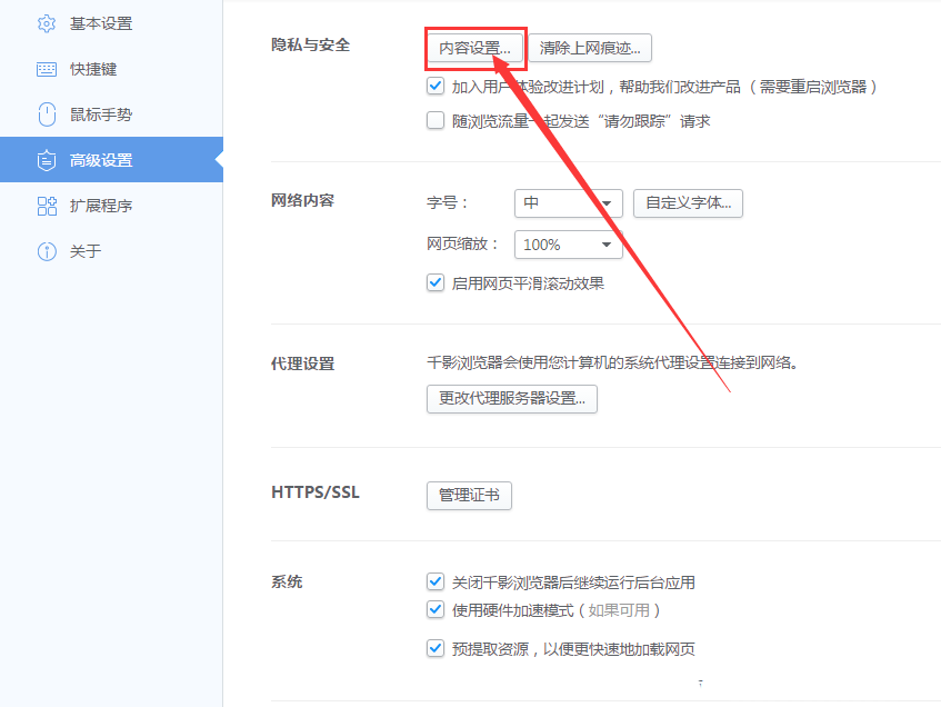 5、进入高级设置后可以看到【隐私与安全】中的【内容设置】点击进入