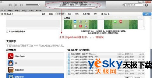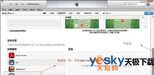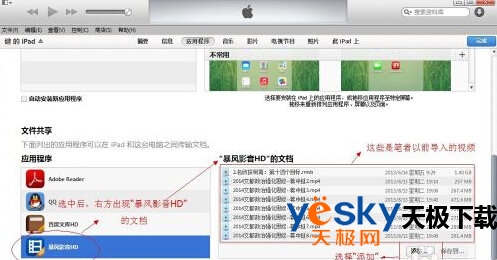 4、进入“应用程序后”,请下拉最右方的的滚动条,找到“文件共享”,然后在其中找到“暴风影音”(或者你在ipad mini中安装的别的视频播放器)。