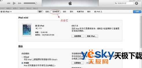 3、上步完成后,会进入如下界面,此处显示一些你的ipad mini的基本信息。在此选择“应用程序”,下图中红框位置处。