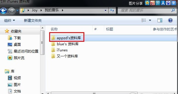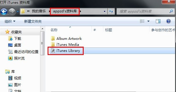 4.打开“appd’s资料库”,双击此文件夹下“iTunes Library”选项,打开iTunes,就可以进行资料同步了