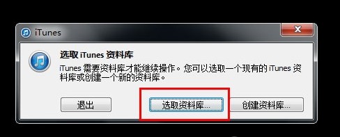 2.桌面弹出“选取iTuens资料库”对话框,选择“选择资料库”;