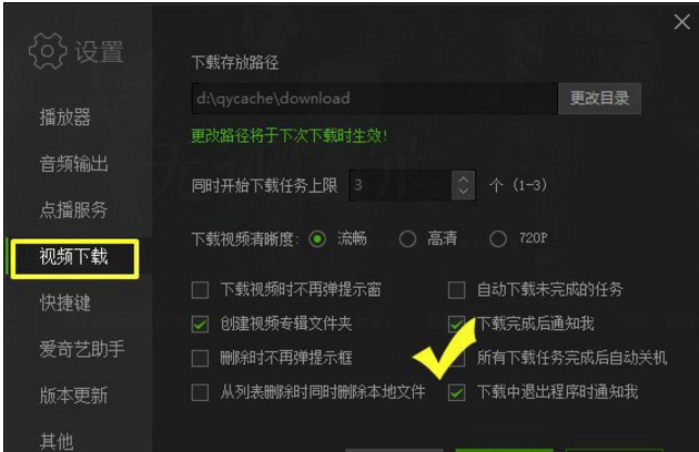 2、在设置界面内点击左边框内的【视频下载】,在右边显示的“下载存放路径”就是下载视频的存放位置,如想更改位置则点击“更改目录”即可,会在下次下载时生效。