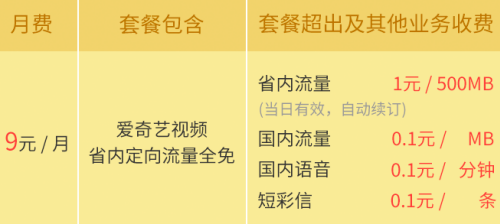 9元/月,爱奇艺视频,省内定向流量全面,超出流量请看下方;