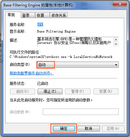 弹出Base Filtering Engine属性窗口,将启动类型调整为【自动】,点击确定,