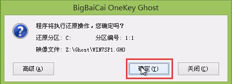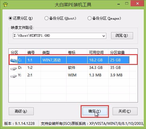 第四步:等待大白菜PE装机工具提取所需的系统文件后,在下方选择一个磁盘分区用于安装系统使用,然后点击“确定(Y)”进入下一步操作。