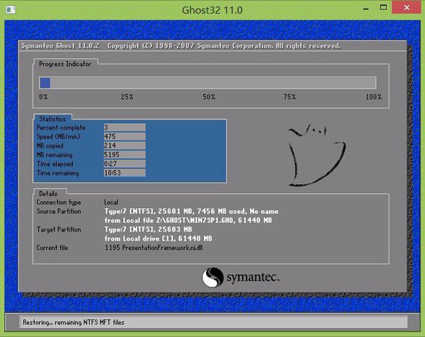第六步:此时耐心等待系统文件释放至指定磁盘分区的过程结束。