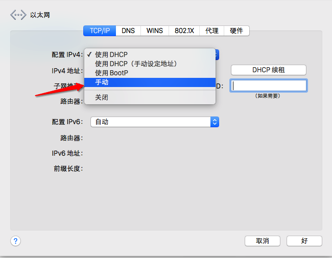 第四步、在以太网设置界面,在TCP/IP选项下,点击“配置IPv4”后面的箭头,选项中点击“手动”