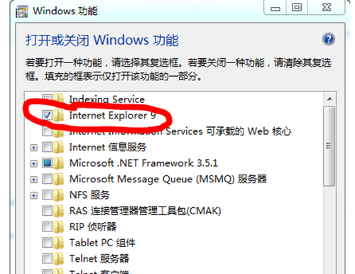 4、打开后,找到“Internet Explorer 9”,这就是我们要卸载的IE浏览器,取消选择前面方框的对钩;