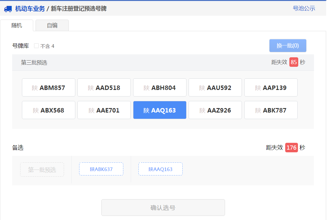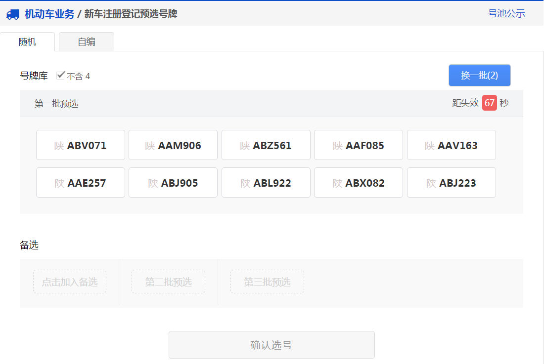 7、用户可以点击右上角“换一批”按钮重新进行随机,此时会更新随机号牌栏中的号牌。 如果备选号牌栏中的有号牌并且没有失效,则备选栏中的倒计时将重新开始倒计时。 用户可以在新随机的号牌号码中选择一个号牌号码作为备选号牌,此时备选栏中的倒计时也将重新开始倒计时。 如此循环操作,用户每次随机选号,都可以从随机号牌中选择一个号牌号码作为备选号牌,直到随机选号次数用完。