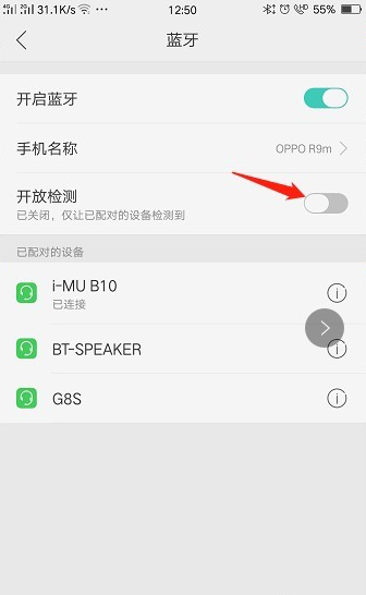 我们进入蓝牙功能后,发现有个蓝牙检测,目前属于开启状态,这样其他人可以搜索到我们的oppo手机蓝牙。