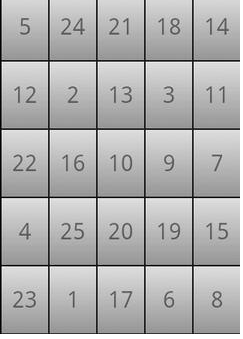 1、首先我们要先了解一下舒尔特表格,他能帮助我们增强注意力在这个表格里一共有25个方格,每个方格里有一个数,你要做的是按顺序从1找到25