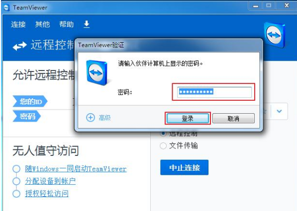 4、这时会跳出“TeamViewer验证”对话框,需要在密码栏输入对方电脑上TeamViewer界面上的密码(一般是4位数字),然后点击“登录”。