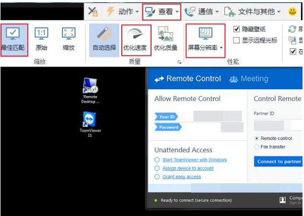 6、在界面上方的工具条中,点击“查看”,其中有若干选项,可以进行屏幕的匹配、优化连接速度、调节分辨率等。