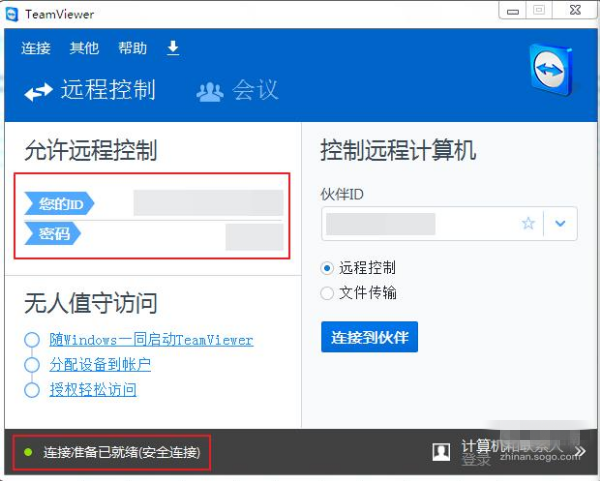 2、TeamViewer软件界面左侧会出现本地计算机的ID和密码,在界面下方会显示“连接准备已就绪”。当双方电脑都出现“准备就绪”提示时,就可以开始连接对方电脑。