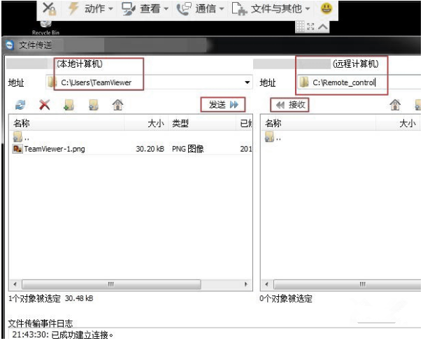 8、在弹出的“文件传送”界面中,左侧是本地计算机文件目录地址,右侧是对方远程计算机文件目录地址。从本地向远程计算机传送文件,要选中文件后点击“发送”;从远程计算机向本地传送文件,要选中文件后,点击“接收”。