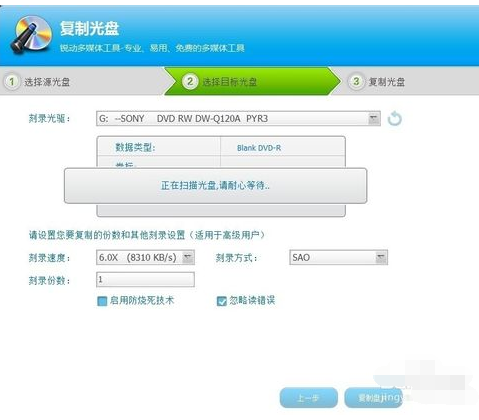 步骤五:如果没找到外置光驱,那会显示如下图。这样的话会先把盘内容复制到电脑上,然后弹出源盘,换上空白光盘后进行复制。(我们略过这一步还是说双光驱)