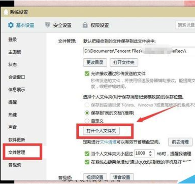 在系统设置面板左侧点击“文件管理”,然后找到小编下图中箭头所指的选项“打开个人文件夹”,我们QQ接受的图片,语音等都被保存在这里。如果你事先设置过保存位置,那么就打开保存的文件位置。