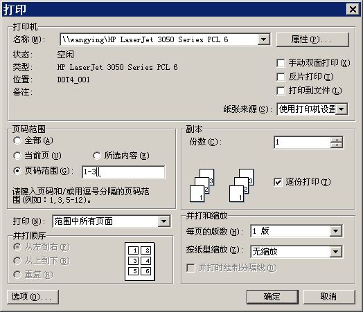 (4)只打印指定页:在“打印”窗口的“页面范围”下进行设置,可选择选择“当前页”项,打印当前光标所在页的内容;选择“页码范围”项,输入指定的页码或页码范围,如“1-3”可以打印出第1页至第3页的全部内容(如图6)。如果要打印第1页和第3页,则只要输入1,3即可。