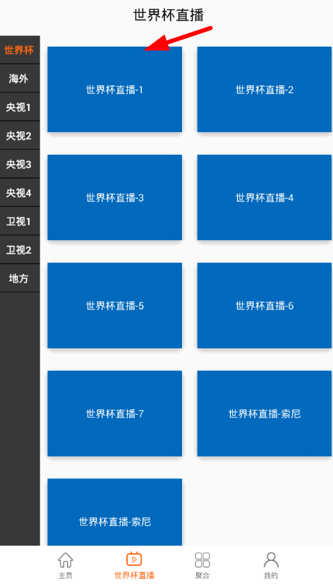 1、先在页面下方选择“世界杯直播”的按钮,进入电视直播页面后就可以观看世界杯了。