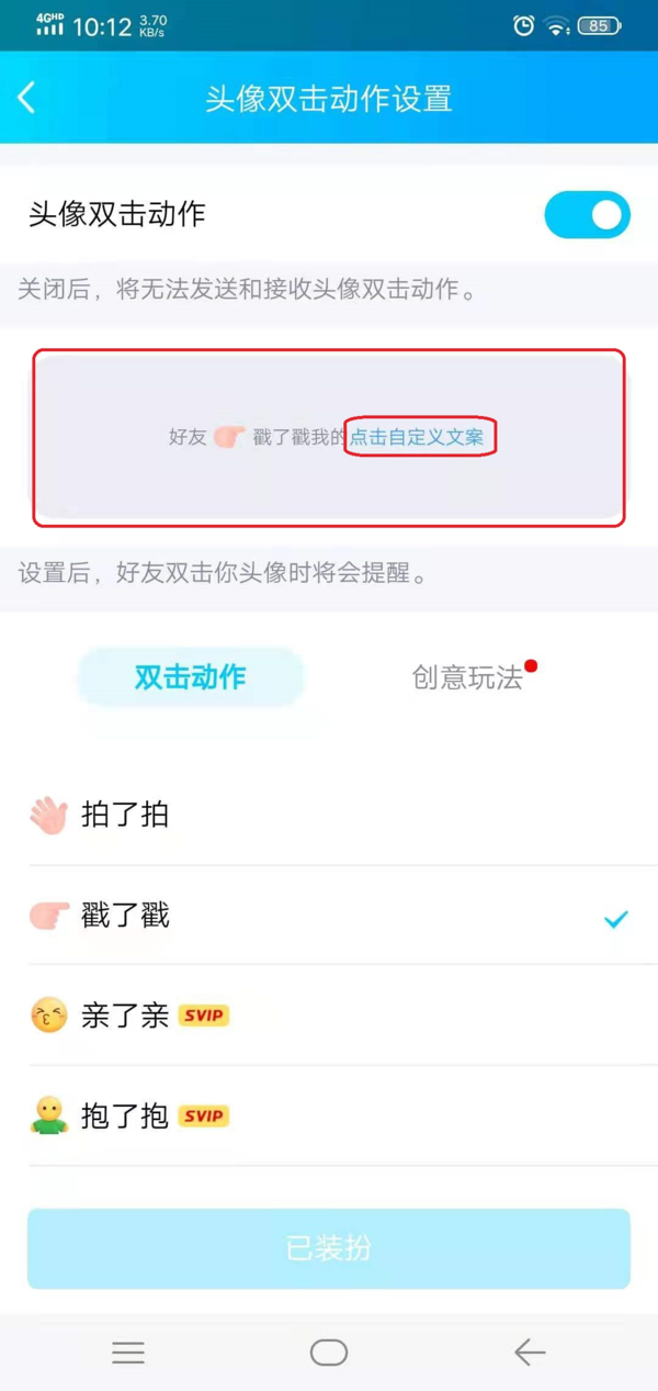 第七步,然后在【双击动作】选项下,我们可以设置双击头像的动作,比如默认的【戳一戳】,或者是【拍一拍】、【揉一揉】等。这里我们选择【拍一拍】功能,最后点击【立即装扮】按钮。