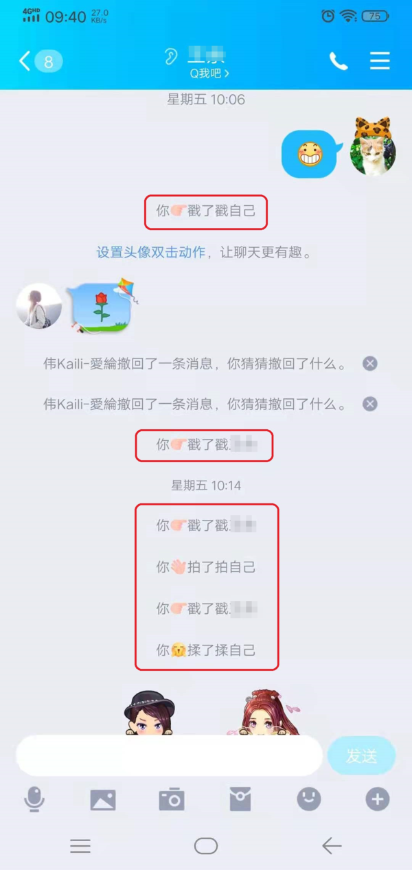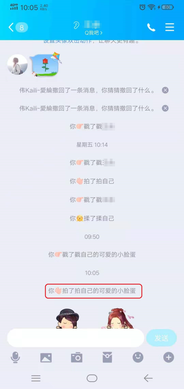 第八步,最后回到与好友的聊天界面当中,当好友双击我们的头像时,便可以在聊天界面中显示我们自定义好的拍一拍功能的后缀内容了,聊天更加好玩了。