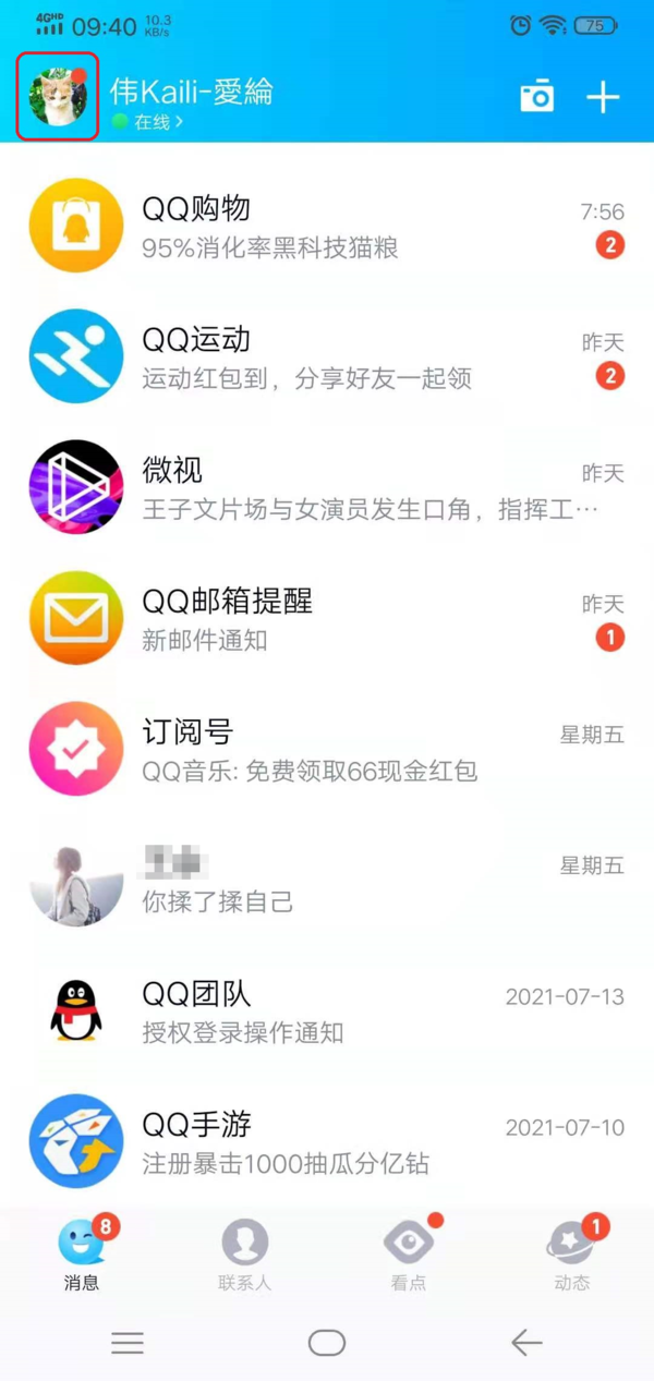 第一步,打开手机上的QQ软件,进入到软件的主界面当中后,找到左上角的【个人头像】图标,并点击进入。