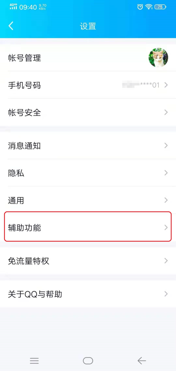 第三步,进入到QQ的设置界面当中后,找到【辅助功能】选项,并点击打开。