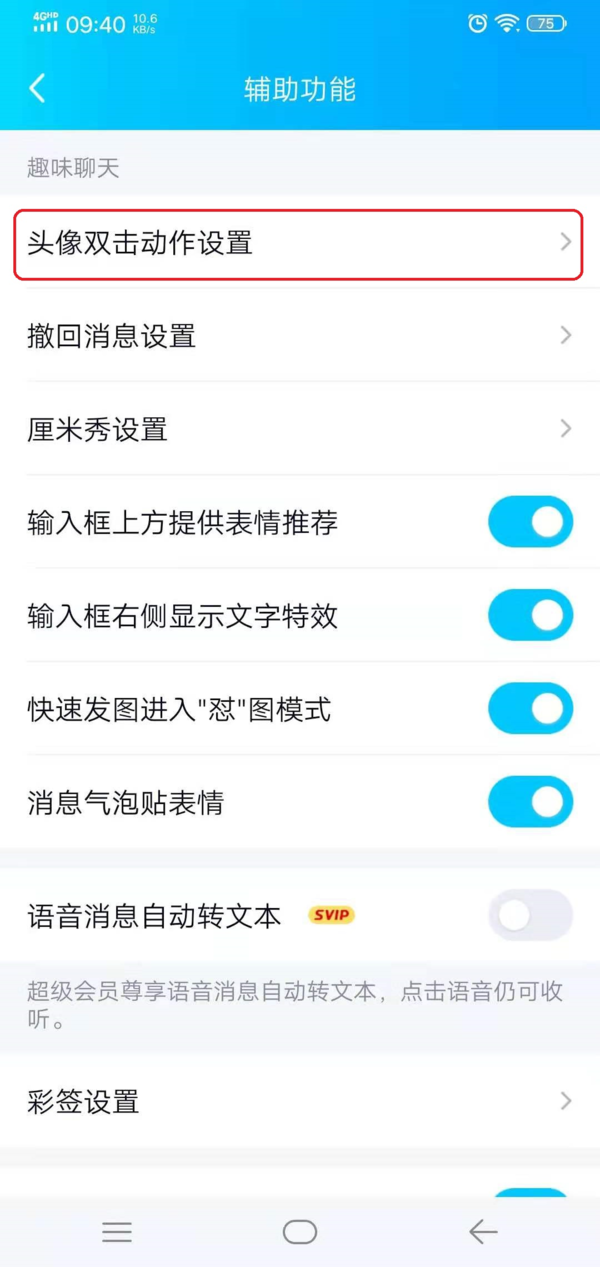 第四步,进入到QQ的辅助功能设置界面当中后,找到【头像双击动作】选项,并点击进入。