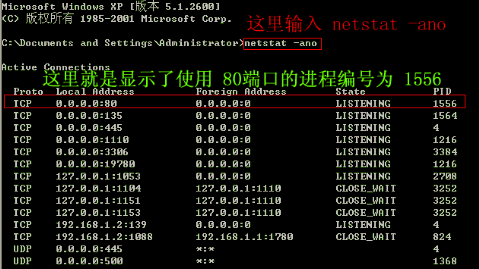 进入命令提示符后 使用 netstat -ano 命令查看目前端口的使用情况