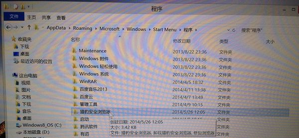 2. 更新完成后,直接在“控制面板”中的“程序和功能”中将“猎豹安全浏览器”卸载; 卸载完成后,请先点击“查看”并在其中的“隐藏的项目”前方打“勾”,之后再到“C:\\User\\用户的文件夹\\AppData\\Roaming\\Microsoft\\Windows\\Start Menu\\Programs”中,找到“猎豹安全浏览器”文件夹,将其删除即可完全卸载猎豹浏览器。如下图示例: