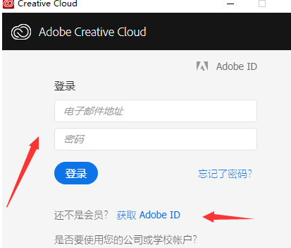 安装完成之后,软件会自动打开,如果你的电脑是第一次安装Adobe软件,那么他会提示你登录你的Adobe账号,如果没有账号可以点击获取AdobeID进行注册一个。有账号登录之后就可以进入PS界面。
