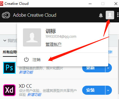在永久注册之前,我们必须要先注销AdobeID账号,就是Adobe Creative Cloud云商店的账号。必须注销掉,这个一定要切记。我们打开cloud之后,点击右上角的头像,出现注销两个字,我们点击注销掉就可以了。